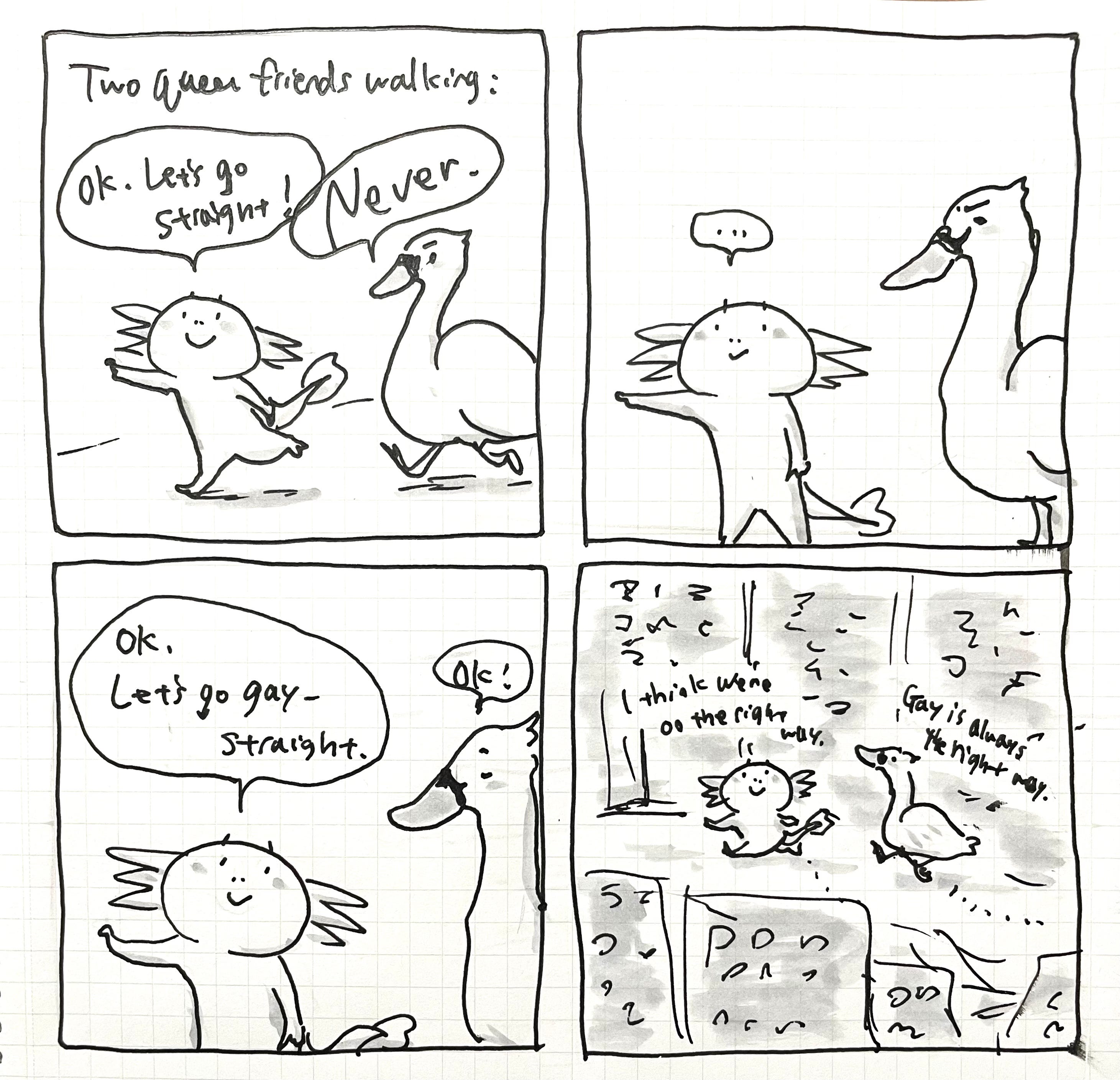 As a friend commented on this comic on Patreon… don’t go straight, go “gayly forward” :)